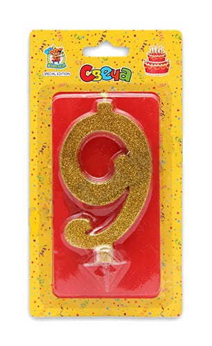 —Свеча для торта 'Цифра 9. Золотой глитер' Миленд, картон. уп., европодвес, С-1901