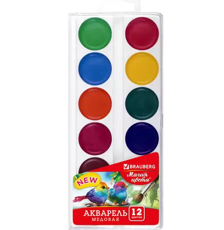 Краски акварельные 12 цв. BRAUBERG 'МАГИЯ ЦВЕТА' , медовые , круглые кюветы, 192286